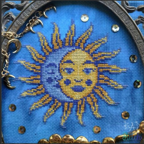 From the designer: "A cross-stitch pattern named after a Panic at the Disco! song, featuring a smiling sun and moon. The gradients in this design make it pop, and your project would look amazing on hand-dyed aida or linen."