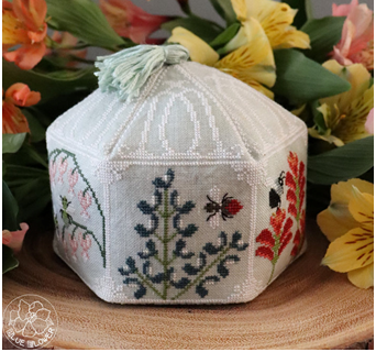 From the Designer: "Even a greenhouse needs pollinators! This piece was inspired by the idea of peering through the windows of an elaborate white-framed greenhouse. The finish offers a great opportunity for stitchers to build on their skills to create a new shape." (Details of the finishing are found on the designer's website)
