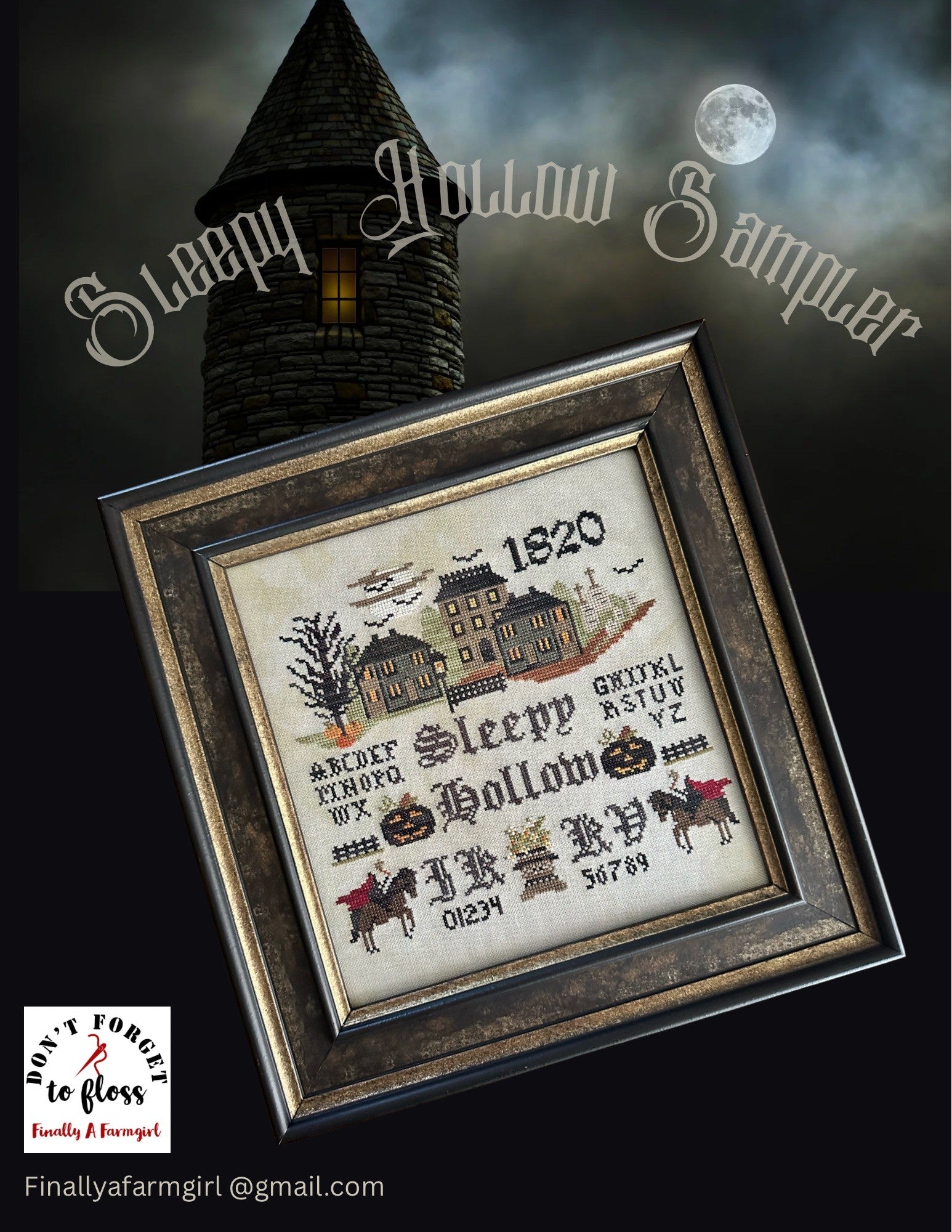 From the designer: Sleepy Hollow Sampler draws on the spirit of Washington Irving’s 1820 classic, “The Legend of Sleepy Hollow”. Whether you are drawn to the spooky allure of the Headless Horseman, the gentle romance of Ichabod Crane and Katrina Van Tassel, or the historical richness of the Hudson River Valley, this sampler invites you to stitch your own chapter into the legend. So gather your threads, settle in by the fire, and let the spirit of Sleepy Hollow guide your needle. The legend awaits-one stitch at a time"