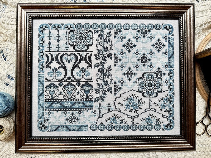 From the designer: "Blue Velvet is a design for all of the blue lovers out there. It features gorgeous, bold borders alongside design elements that have the feel of old-fashioned wallpapers. This design uses only four colors of blue variegated cottons, creating a beautiful tapestry of stitching."
