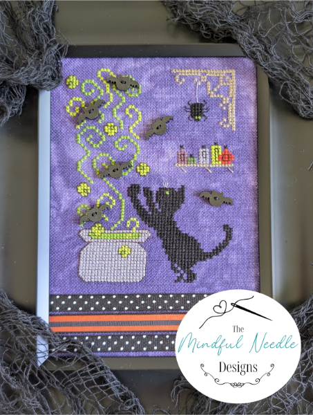 From the designer: "This mischievous cat has brewed up a real batch of trouble! Six bat buttons (from Willoughby Ann) are included with each pattern. "
