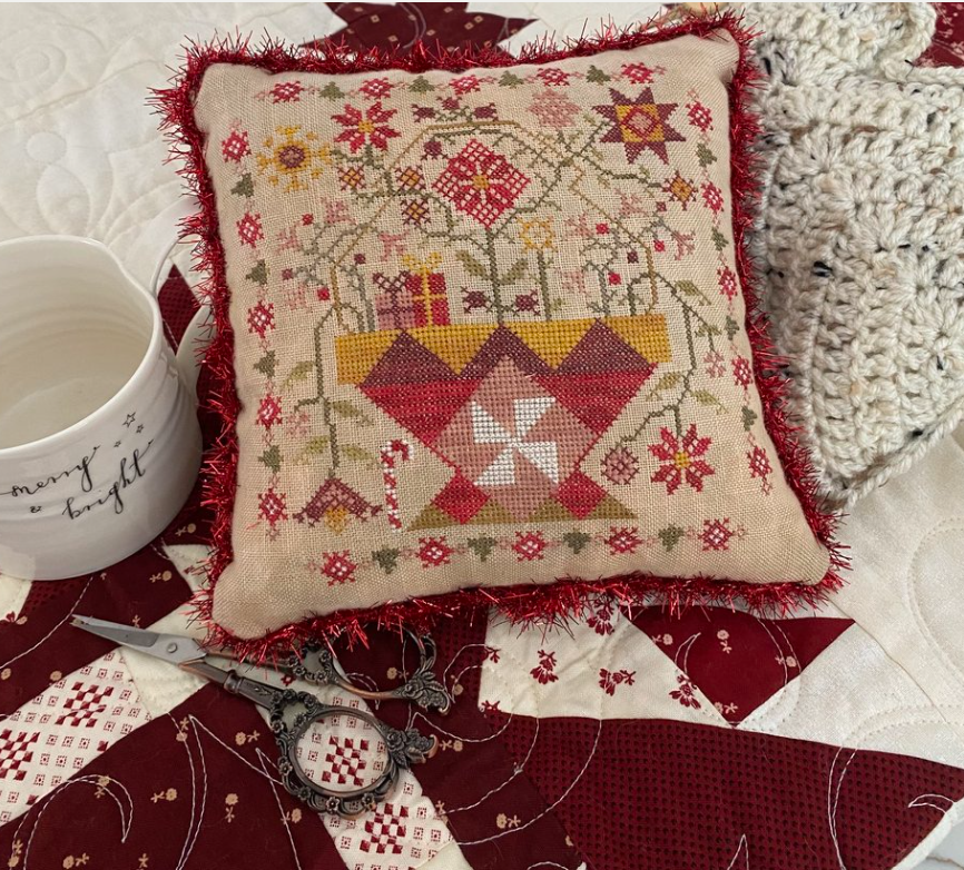 From the Designer: "The third of four in my new seasonal series, Betsy’s Patchwork Baskets Series. Each seasonal chart will feature a different patchwork basket full of flowers. Betsy’s Winter Basket is finished as a pinkeep with pretty chenille trim in Brick by Lady Dot Creates and filled with crushed walnut shells and fibrefill."